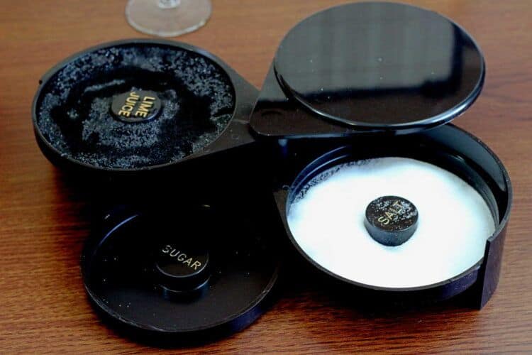 Pour your salt in the salt compartment, sugar in the sugar… if you’re doing a graham cracker or chili rim or something unusual, you can pour that in one of the compartments instead of salt or sugar, or you can just use a saucer.