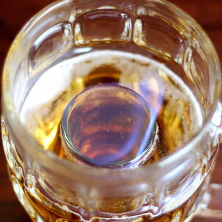 - Pour beer into the mug, around the shot glass, and to the top of the shot glass.
